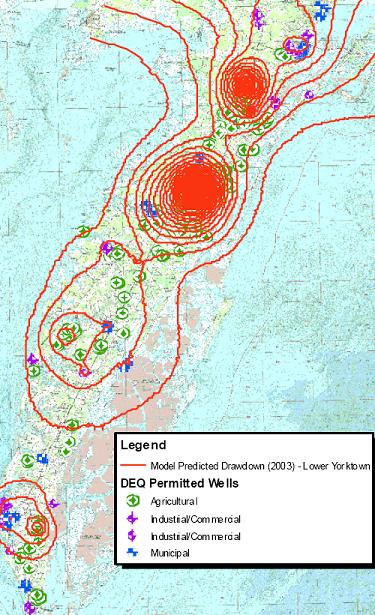 Since 2003, the Committee has had an agreement with the USGS to develop and calibrate a ground water model for the Eastern Shore of Virginia. The major focus of the model is simulation of water levels in the various aquifers and simulation of chloride concentrations.